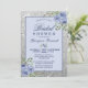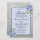 Blumenblau Silberblauer Glitzern-Bridal-Dusche Einladung Das Design ist mit hellen und dunkelblau blumenblauen Aquarell-Blume Bouquets auf einem hellblauen und silbergrauen Glitzer Glitzern.