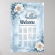 Blumenrahmen mit Rose und keltisches Design. Das Bild ist mit einem zarten Blumenrahmen mit einer weichen, traumhaften Ästhetik versehen. Weiße Rosen mit subtilen beigefarbenen Zentren und gedämpften blau-grünen Blätter schmücken die links Oben- und Unten-Rechts-Ecken. Der Rahmen selbst ist aus einem eisblauen, keltisch inspiriert Design gefertigt. Im Hintergrund ist ein schwaches, kreisförmiges keltisches Knoten-Muster sichtbar.