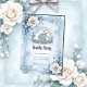 Blumenrahmen mit Rose und keltisches Design. Das Bild ist mit einem zarten Blumenrahmen mit einer weichen, traumhaften Ästhetik versehen. Weiße Rosen mit subtilen beigefarbenen Zentren und gedämpften blau-grünen Blätter schmücken die links Oben- und Unten-Rechts-Ecken. Der Rahmen selbst ist aus einem eisblauen, keltisch inspiriert Design gefertigt. Im Hintergrund ist ein schwaches, kreisförmiges keltisches Knoten-Muster sichtbar.