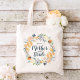 Maßgeschneiderte Hochzeitstaschen mit Brautparty personalisiert mit dem Namen der Braut oder anderen Sondertext. Dieses elegante feminine Design hat einen Blumenkranz in Aquarelltönen mit staubigen Blüten in blau-grau und pachelgelb. Verwenden Sie die Designtools, um jedes Monogramm individuell zu gestalten, eine beliebige Hintergrundfarbe zu wählen, Schriftart und Farben zu bearbeiten und Fotos hinzuzufügen, um eine Art Tasche für Ihre Hochzeitsfeiergeschenke zu erstellen.
