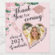 Erstellen Sie personalisierte Blütenpinke Dankeschön Flaschenetiketten für die Graduation Party 2025 und Favoriten mit einem eleganten mädchenhaften Design, das ein Herz-Form-Foto, den Namen und das Jahr des Graduates aufweist und mit rosa Rosen, Gradmütze und Diplomabbildungen verziert ist. Verwenden Sie die Vorlage, um den Namen und das Jahr Ihres Grad einzugeben und ein Bild vor der Bestellung hochzuladen.