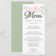 Das elegante Design der Speisekarte besticht durch die rosa Rosen, die in modernem Grün eingebettet sind. Menü wird in einem schönen großen Skript-Schriftart geschrieben. Es gibt Platz für Sie, um vier Kurse aufzulisten und zu beschreiben. Sie können einfach Ihre Informationen hinzufügen und die Position anpassen. Die Rückseite der Speisekarte ist in Weiß gehalten, mit einem sehr subtilen Blatt Muster.