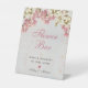 Ein Blume Bar Zeichen für ein Brautparty / Hochzeit / Polterabend. An der oberen Grenze gibt es rosa und weiße Orchideen. Der Titel "Blume Bar" und die Namen der Braut und des Bräutigams sind in einer eleganten kalligrafischen Schrift geschrieben, die Kachel in Rosa, die Erholung in schwarzen Kappen. Über den Namen gibt es ein kleines rosa Herz. Der Hintergrund ist aus weißem Marmor.
