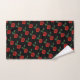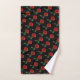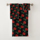 Dieses vorzügliche Blumenbadtuch-Set zeigt ein wiederholendes Muster einer perfekten Single Scarlet-Roten Rose mit drei grünem Blätter gegen einen schwarzen Hintergrund an.