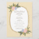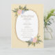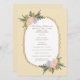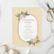 Elegante Hochzeitseinladung illustriert mit einem skurrilen ovalen Rahmen und Aquarellfarben-Blume in pfirsichrosa, zartes Gelb und süß-blau. Dunkelgrüne Blätter und Zweige, zusammen mit einer Silhouette eines Paares, die von Vintagen Kameos inspiriert wird, sind mit extravagantem Skript-Schriftart verheiratet. Dieses Design lässt sich einfach anpassen und der Hintergrund kann an die Farbe Ihrer Wahl angepasst werden.
