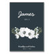 Blumenkarten für Hochzeitsfeiern mit weißer Blume und auf dunklem Hintergrund bedruckten, anpassbaren Platzkarten