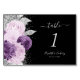 Die links Tischnummer dieses eleganten Hochzeitszeichens zeichnet sich durch einen Blumenstrauß in lila und Lavendeltönen aus, bestickt mit Silberfolie aus Imitat und Imitat aus Glitzer und mit Glitzer aus silbernen Imitaten bestreut. Das Wort "Tabelle" erscheint in silbergrau whimsical Handschrift Skript auf einem schwarzen Hintergrund, mit der Zahl unten, zusammen mit den Namen des Paares und dem Hochzeitstag.