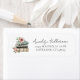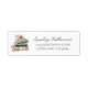 Ein charmantes Versandlabel mit Rücksendeadresse, inspiriert vom Thema "Ein neues Kapitel beginnt", perfekt für eine Babyparty oder Hochzeitsdusche. Auf der linken Seite wird ein Wasserfarben-Stapel aus drei Büchern in Tönen von Beige, Grau und Grün von zarten Wildblumen und Grünzeug in sanften Rosa-, Gelb-, Blau- und Violetttönen ergänzt, was einen fröhlichen, märchenbuchinspirierten Touch hinzufügt.