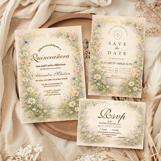 A joyful meadow of watercolor wildflowers blooms along the base of this elegant quinceañera design. Soft blush cosmos, delicate white daisies, buttery yellow blossoms, and airy blue florals rise against a warm parchment background, creating a fresh garden feel with timeless charm. Refined gold typography adds a graceful, celebratory touch while keeping the composition light and balanced. Perfect for a quinceañera celebration filled with romance, color, and countryside elegance.
