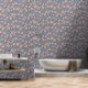 Beautiful modern floral wallpaper with a pattern of blush flowers in a simple modern style with vines and leaves in silver gray curling like tendrils around the pretty flowers against a muted dark blue background. This blush and blue floral wallpaper will look great in your home. Why not in your living room or your bedroom, either the whole room or as a gorgeous accent wall.