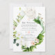 Blütenrosa und tropische Vegetation Sommer Aquarell florale Fledermaus Mitzvah einladen weiße Orchideen, weiße Königsproteas, Magnolien, Eukalyptus und tiefe Vegetation.