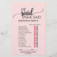 Dieses in Rosa rot gehaltene Kalligrafie-Hochzeitssymbole-Suchspiel eignet sich perfekt für ein elegantes Brautparty. Auf der Vorderseite der Spielkarte steht "er sagte, sie sagte", was ein lustiges Quiz über Braut und Bräutigam ist. Auf der Rückseite der Karte finden Sie ein Wort mit Wörtern und Phrasen, die mit Hochzeiten zusammenhängen. Das Design besticht durch einen romantischen und süß fließenden, kursiven Schriftart auf einem zarten, hellen Ballett-rosa Hintergrund. Personalisieren Sie die Spielkarte mit dem Namen und dem Datum des Brautparty der Braut.