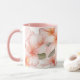 Bring tropical elegance to your everyday moments with this beautifully designed mug featuring soft blush pink frangipani (plumeria) flowers. The petals blend gentle peach, blush, and ivory tones, with hints of golden warmth and fresh green leaves for balance. The interior glaze, handle, and rim in soft pastel pink add a modern yet feminine finishing touch.