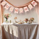 The styling evokes an elegant garden brunch scene, where flowing florals and graceful curves replace bold contrast, allowing the eye to move smoothly from one element to the next. The repeated banner shapes create visual balance, while the soft pastel background tones provide a refined backdrop that feels cohesive and calm. This aesthetic pairs beautifully with rococo-inspired table settings, romantic tea gatherings, and intimate celebrations centered around friendship and connection.