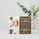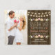 Fügen Sie Ihr Lieblings-Verlobung-Foto oder Bild zu dieser rustikalen Lichterkette Save the Date Postcard, die Teil einer Fall floralen rustikalen Lichterkette Hochzeit Einladung Set in rot, Korallen, grün, braun, weiß, gelb und braun Farben mit einem schönen Holzhintergrund erinnert an einen Holzzaun oder -fass. Ein Herbstkranz aus Eicheln, Beeren, Sonnenblumen, Tulpenblüten und weißen Blüten sitzt auf einem grünen Ast. Die Worte Save the Date sind von zwei Korallenherzen flankiert. Perfekter Begleiter für einen Outdoor-Herbst, Land, Bauernhof, Barnyard oder ländlich schicke Themenhochzeit. Fügen Sie eine besondere Nachricht für Ihre Gäste auf dem antiken Vintagen Pergament-Look Hintergrund auf der Rückseite des Stds. Die zauberhaften Tinkle- und Märchenleuchten mit Bokkeh-Effekt wirken hell, warm und einladend. Artwork © Chrissy H. Studios, LLC. Alle Rechte vorbehalten.