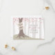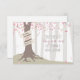 Eine Hochzeit im Freien speichert das Datum mit einer Abbildung eines Waldbaumes mit rosa Blätter und sichtbaren Wurzeln mit einem Banner, der um den Kofferraum für die Namen von Ehepaaren herum gewickelt ist.