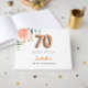 Für eine elegante und weibliche 70. Geburtstagsfeier. Ein schick weißer Hintergrund. Dekoriert mit einer Rose Gold und rot rosa Rose Blume, florale, grüne Eukalyptus Blätter, Sprigs, Grün und Imitat Goldsprigs. Personalisieren und Namen und Titel. Schwarze und goldene Buchstaben. Der Name ist mit einem modernen handgeschriebenen Stilskript geschrieben. Nummer 70 ist mit einem goldenen Schriftart im Ballonstil geschrieben. Spine: Fügen Sie Ihren eigenen Text hinzu.