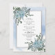 Dusty blauen Aquarellfarben Blume und Blätter blumengeschmückte Winterhochzeit Einladung. Dieses elegante Design zeigt einen silbernen Rahmen und staubblaue Aquarellfarben-Blume mit sukkulenten und eukalyptusfarbenen Blätter an den oberen und unteren rechten Ecken und Ihrem Text in Grau und Schwarz. Hinter dem Rahmen befindet sich ein blauer Splash-Hintergrund.