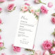 Erhöhen Sie Ihren Hochzeitsempfang mit unserem Watercolor Blush Floral Wedding Menu. Diese elegante Karte bietet ein sanftes, wasserfarbenes Blumendesign in schönen Blütentönen, das ein romantisches und raffiniertes Hochzeitsthema perfekt ergänzt. Lassen Sie sich von den sorgfältig ausgewählten kulinarischen Angeboten des Hauses verwöhnen, sodass Sie sich wie zu Hause fühlen. Ideal für Hochzeiten mit Blumen, Garten oder Frühling, wird dieses Menü Ihren Tisch mit zeitlosem Charme bereichern.