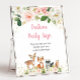 Erstellen Sie Ihr eigenes Party-Zeichen! Das Design umfasst niedliche Waldtiere mit rot-rosa Blumen und goldenen Folienakzenten.
