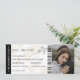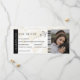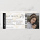 Moderner, minimalistischer Monogramm-Boarding passieren Hochzeitsfahrkarte mit einem schlichten, weißen und braunen Hintergrund, ein Foto des verlobten Ehepaares, ein Flugzeug mit Loop-Trail und eine personalisierte Save the Date Vorlage, die leicht zu personalisieren ist. Vergessen Sie nicht, den Text des Monogramms auf der Rückseite zu aktualisieren.