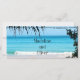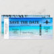 Ein schönes Strandbild ist der Hintergrund für diesen Boarding Pass Ziel HochzeitSpeichern Sie das Datum. Ein lustiges Ziel maßgeschneidertes Hochzeitsdesign. Tropischer Strand mit Aqua-Blues und modernem Text.