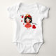 Jolie petite princesse avec des roses rouges, robe rouge et cheveux noirs