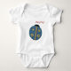 Un joli patchwork de style campagnard à carreaux bleu courbé avec taches de plaid rouge et vert et bords brodés rouges. Texte : Bébé ! Motif imprimé, pas matériel réel.