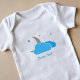Un costume de bébé comprenant un design céleste et éthérée avec une lune grise, des nuages bleus et quelques étoiles et un texte français personnalisable "Bonne Nuit !" : un beau cadeau pour un nouveau-né !
