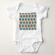 Ce maillot de bébé a un design moderne du milieu du siècle de cercles orange ouvert avec des cercles turquoises solides qui traversent le motif avec des lignes verticales turquoises et des lignes horizontales orange.