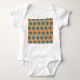 Ce maillot de bébé a un design moderne du milieu du siècle de cercles orange ouvert avec des cercles turquoises solides qui traversent le motif avec des lignes verticales turquoises et des lignes horizontales orange.