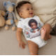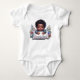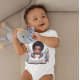 Un adorable bébé afro-américain portant un body avec une image d'une peinture acrylique d'un petit avec ses mains précieuses posées sur son oreiller.