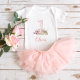 Chemise de bébé ou maillot de bébé personnalisé pour la fête d'anniversaire de votre petite fille ou photos cassées de gâteau. Ce design sucré présente une aquarelle rose sucrée numéro un entourée de fleurs de saumons et d'un cerf de bébé. Idéal pour une fête d'anniversaire fantaisiste en bois ! Personnalisez-le avec le nom de votre enfant ou tout autre texte personnalisé. Utilisez les outils de conception pour ajouter des photos, customiser les polices de texte et les couleurs pour créer un design unique de t-shirt de premier anniversaire.