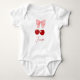 Adoptez le style coquette tendance avec ce design mignon mettant en vedette un noeud rose et un graphique de cerise rouge. Facile à personnaliser avec le nom du bébé ou vous pouvez choisir de le laisser vide et avoir juste le graphique.