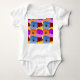 Ce maillot de bain a une conception ressort de violet, bleu, orange et rouge avec des panneaux jaunes disposés l'un sur l'autre sur un champ de jaune.