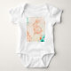 The image shows a cute, repeating pattern of rabbits and flowers in turquoise and orange on a light background.