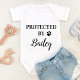 Protégé par la sécurité canine ! Faites savoir à tout le monde que votre meilleur chien et nouveau chien de garde est dans la maison accueillante de votre nouveau bébé avec ces adorables vêtements de bébé pour chien. « Protégé par... le nom de votre chien » avec empreinte de patte. Cadeau parfait pour une baby shower pour une maman de chien, ce body bébé pour amoureux des chiens sera un favori ! COPYRIGHT © 2020 Judy Burrows, Black Dog Art - Tous droits réservés. COPYRIGHT © 2020 Judy Burrows, Black Dog Art - Tous droits réservés. Body bébé personnalisé protégé par un chien