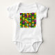 Ce bijou de bébé a un design moderne du milieu du siècle de triangles superposés dans des couleurs fleuries courant verticalement sur un champ de vert.