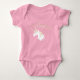 Cette conception de produit présente une illustration de licorne contemporaine avec des bulles et le mot, Magique. L'illustration de l'animal mythologique en blanc et rose rose clair fait un costume moderne et unique pour bébé fille.