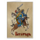 Une représentation d'une bataille entre un bogatyr russe et un guerrier asiatique, tous deux à cheval. Le texte cyrillique (russe) qui se lit "Б о г т ы р" (Bogatyr) apparaît également. Les Bogatyri sont des personnages héroïques trouvés dans les épopées slaves médiévales. Ils ressemblent aux chevaliers errants de la littérature occidentale. La plupart des histoires de bogatyri tournent autour du tribunal de Vladimir Ier de Kiev (958-1015). Certains bogatyri sont considérés comme des figures historiques. Bogatyri protégeait la terre et le peuple russes contre les envahisseurs, en particulier les Tatars. Certains se sont vus attribuer des pouvoirs et des forces presque divines. Cette image est adaptée d'un dessin en noir et blanc dans "П о в с т ь de de de de de de de de de de de de de de de de de de de de de de de de de la ville d'or" (A Tale ev et le Grand Fléau de la Terre Russe) par Tamara Likhiotal ; publié en URSS en 1974.
