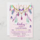 Bohemisches Design mit Baby Dusche Einladungs-Karte mit Amerikanische Ureinwohner Traumfänger, Federn und Schmetterlingen.