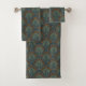 Dieses Badetuch-Set mit einem skallopierten Fächermuster in Erdgrün, Rost auf Marineblau für einen böhmischen Look.