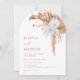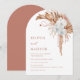 Diese elegante zeitgenössische Hochzeitseinladung zeigt aquarellgemalte Orchideenblüten und Terrakotta-Pampasgras auf weißem Hintergrund.