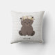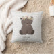 Ein Kopfkissen mit einem Holzdesign und einer Abbildung eines Babybären über einem grauen Holzboden. Personalisieren Sie den Namen. Der Bär trägt eine Blume.