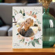 L'élégant faire-part de graduation de photo florale comprend une photo ronde encadrée de fleurs d'aquarelle et de feuillage dans des tons de pêche inspirés du désert de sauge, blanc, ivoire et vert sauge. La garniture en feuille d'or rose complète le look. Personnalisez avec le nom de votre diplômé, l'année de classe et l'école. Ajoutez un message personnel à l'arrière, ainsi qu'une photo supplémentaire.