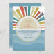 Unique, contemporain, pastel, tendance, boho, coloré et bleu aqua invitation à mariage de plage avec script de calligraphie simple et soleil abstrait au-dessus de la mer.