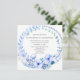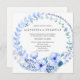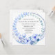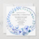 Eine blumengeschmückte Hochzeitseinladung mit einem großen blauen Kranz aus Blume, Beeren und Blätter. Wenn Sie eine Hochzeitsfeier, eine rustikale Hochzeit oder eine Gartenhochzeit planen, wäre diese blaue Blüteneinladung in der Tat sehr gut geeignet.