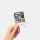 Charmantes vertikales Abzeichen für Innenarchitekten, Stylist, Makeup-Künstler oder Ähnliches mit handgezeichnet Blume in lebhaften Farben vor blauem Hintergrund und einer rot-rosa Aquarellstruktur. Personalisieren Sie Ihre Daten mit Ihrem Namen, Titel und Foto.