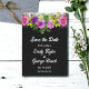 Diese elegante Blumenhochzeit erspart die Einladung zum Datum und ist ideal für eine moderne Blumenhochzeit. Das romantische Design besticht durch einen farbenfrohen Blumenstrauß in Aquarellen mit eleganter weißer Typografie auf schwarzem Hintergrund.
