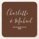 Add a personalized touch to your wedding decor with our Boho Brown Script Minimalist Wedding Square Paper Coasters! These coasters can be customized with the names of the bride and groom, along with the date of the wedding.